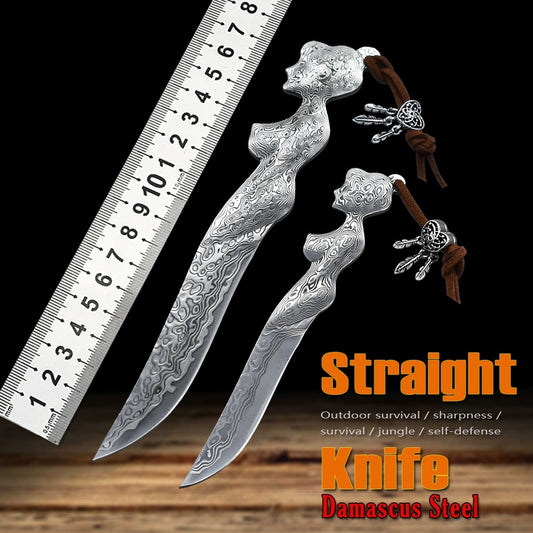 Damascus Blade Portable EDC Knife Self-Defense Hunting with Leather Case