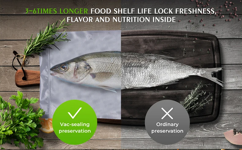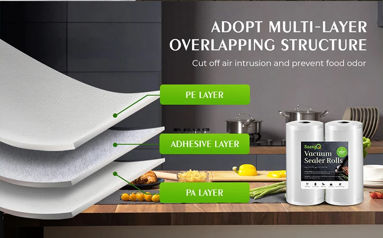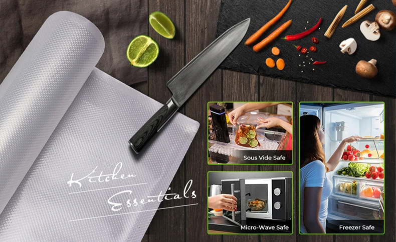 ✅【High Quality】:Two layers 4 mil heavy-duty vacuum sealer bags roll with embossed air-removal channel which are stable for heat and cold, boilable, freezable, microwave and dishwasher machines. Perfect for Sous Vide cooking. Eliminating freezer burn and dehydration to keep your food fresher, juicy and flavorful.